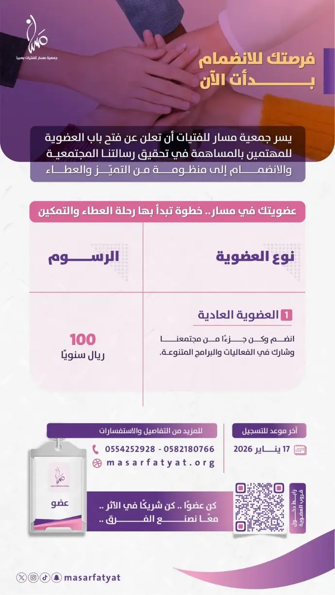 جمعية مسار للفتيات تفتح باب العضوية لكل من تؤمن بالعطاء وصناعة الأثر، وتسعى لأن تكون جزءًا من منظومة مجتمعية ملهمة تُحدث فرقًا حقيقيًا 🌱
